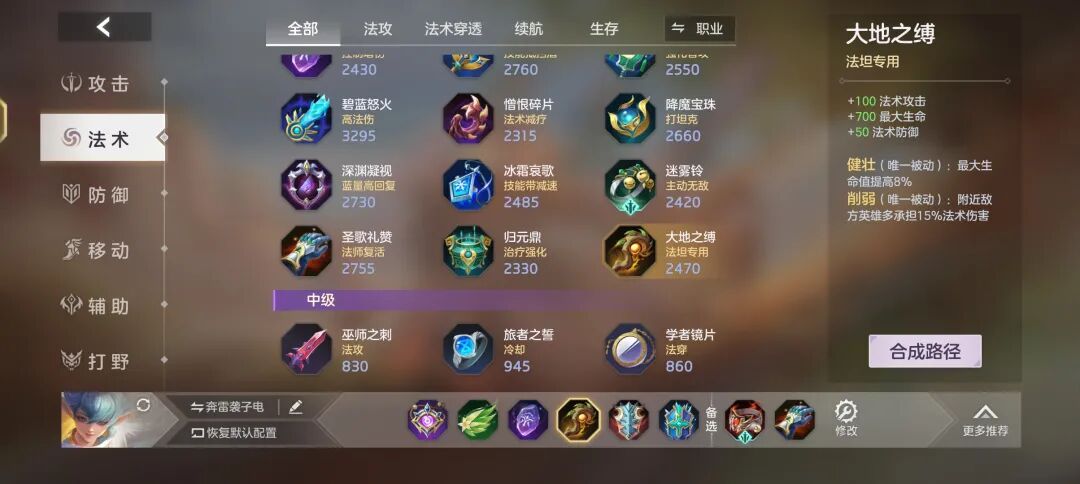 第三件装备选择大地之缚,岚的大部分技能都需要近距离进行输出,而大地之缚也需要在敌人身边,而且如果你们c位是法师或者法射,这个效果也可以配合你们家法师打出更高的输出。