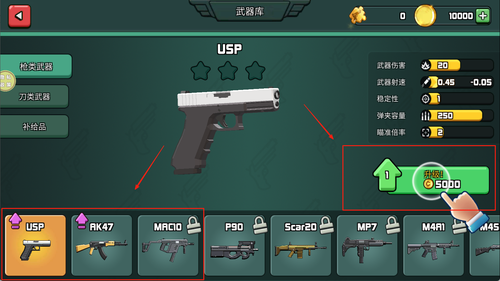 3、收集金币和道具,可以进行枪械升级,成功抵达终点或击败对手即可完成关卡任务。