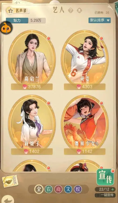 每个人才都有自己的羁绊艺人,升级艺人的人才缘分可大幅提升人才能力。