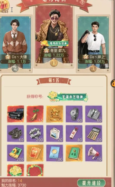 第2~3天晚上接近22:00时可根据当前所拥有魅力道具进行选择消耗,从而获得理想的榜单排名。最后祝愿各位老板的店铺蒸蒸日上,夜夜暴富啦!