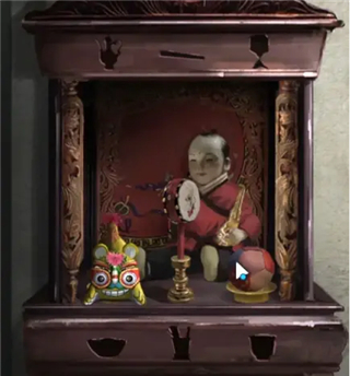 11、返回化妆间,将布偶放化妆间的神台,得到道具房里面坐上架子物件摆放的提示;