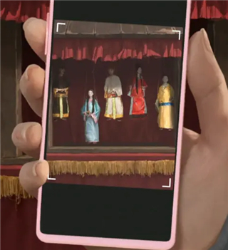 ⑩椅子交给戏台上站着的小人,再次通过望远镜看皮影,拿到酒壶。回到后面,在海报上画笑脸。