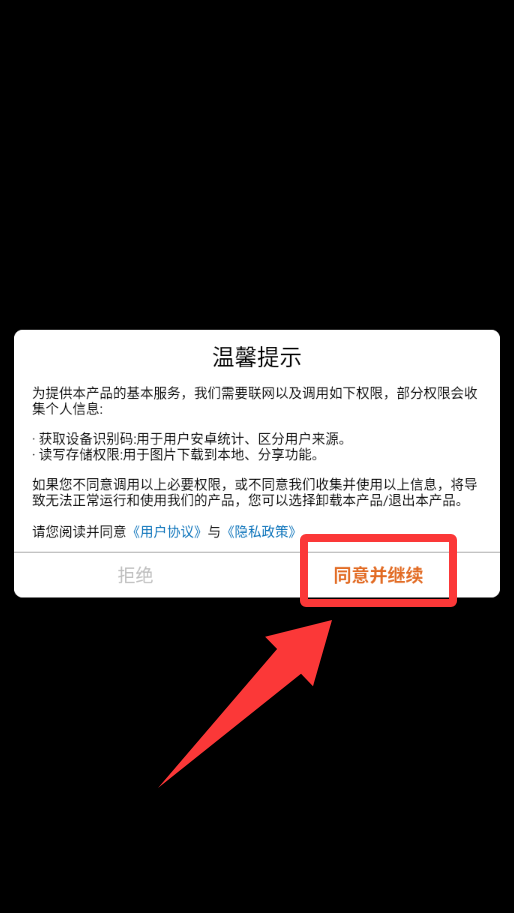 1、点击温馨提示里的同意并继续。