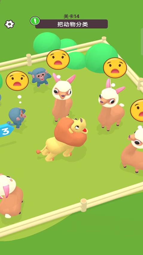 2、关卡14:拖动狮子,与羊驼、猴子区隔,按种类归置,达成【动物分类】。