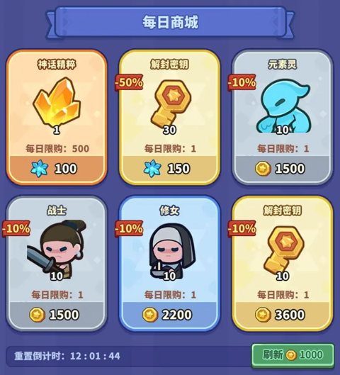 2、游戏主界面左下角的“商城”内、“每日商城”位置、每天会随机刷新。其中的用金币购买的道具、游戏初期每天尽量买光、提升英雄等级来提升总暴击。有白色到金色的英雄碎片、金钥匙、冰镐等等。