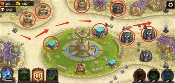 如:老城回廊这场战役,敌军会从上下两路进攻我方阵地,且前期的杂兵数量较多。所以在前期经济不充裕的情况,优先在T字路口建立两个炮台保证输出,利用英雄维鲁克的英雄技能与呆头鹅组成初期拦截攻势,就能顺利发育到后期。