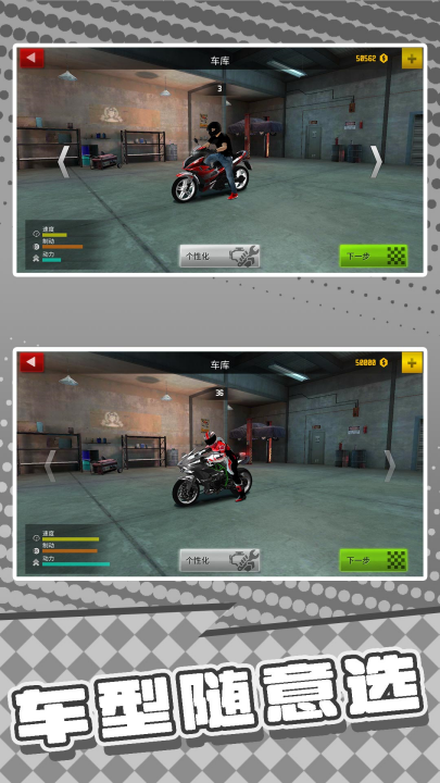 2、通过竞赛获取资源,不断升级摩托车的核心性能,显著增加在直线与转弯中的表现。