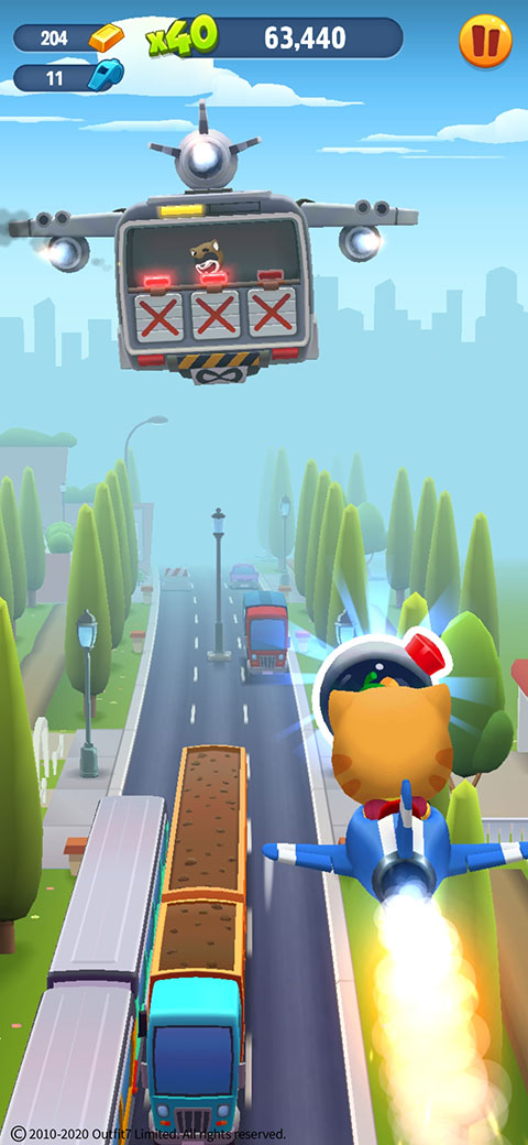 “飞机”或许是汤姆猫跑酷里人气值最高的道具了。玩家拾取该道具后,可在一段时间内驾驶飞机翱翔天际,完全不必担心撞上障碍物同时,飞行路线上还会出现大量金条,只要操作得当,这段“上天”时间就能让你赚得盆满钵满。需要注意的是,飞机的飞行速度比玩家在地面跑酷的速度快很多,如果手速不够快,便可能错过捞金的大好时机。因此,想要成为合格的飞行员,小伙伴们就得努力提升自己的变道技术。