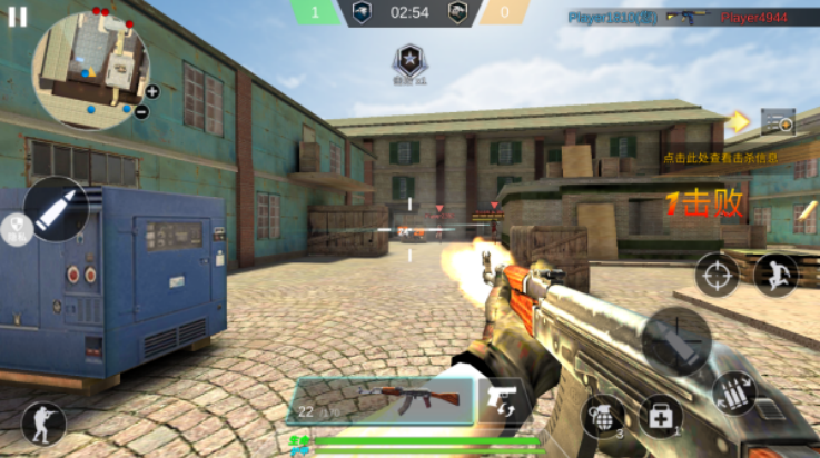 4、左侧轮盘控制移动,右侧控制射击以及道具使用,下方可以更换武器枪支。