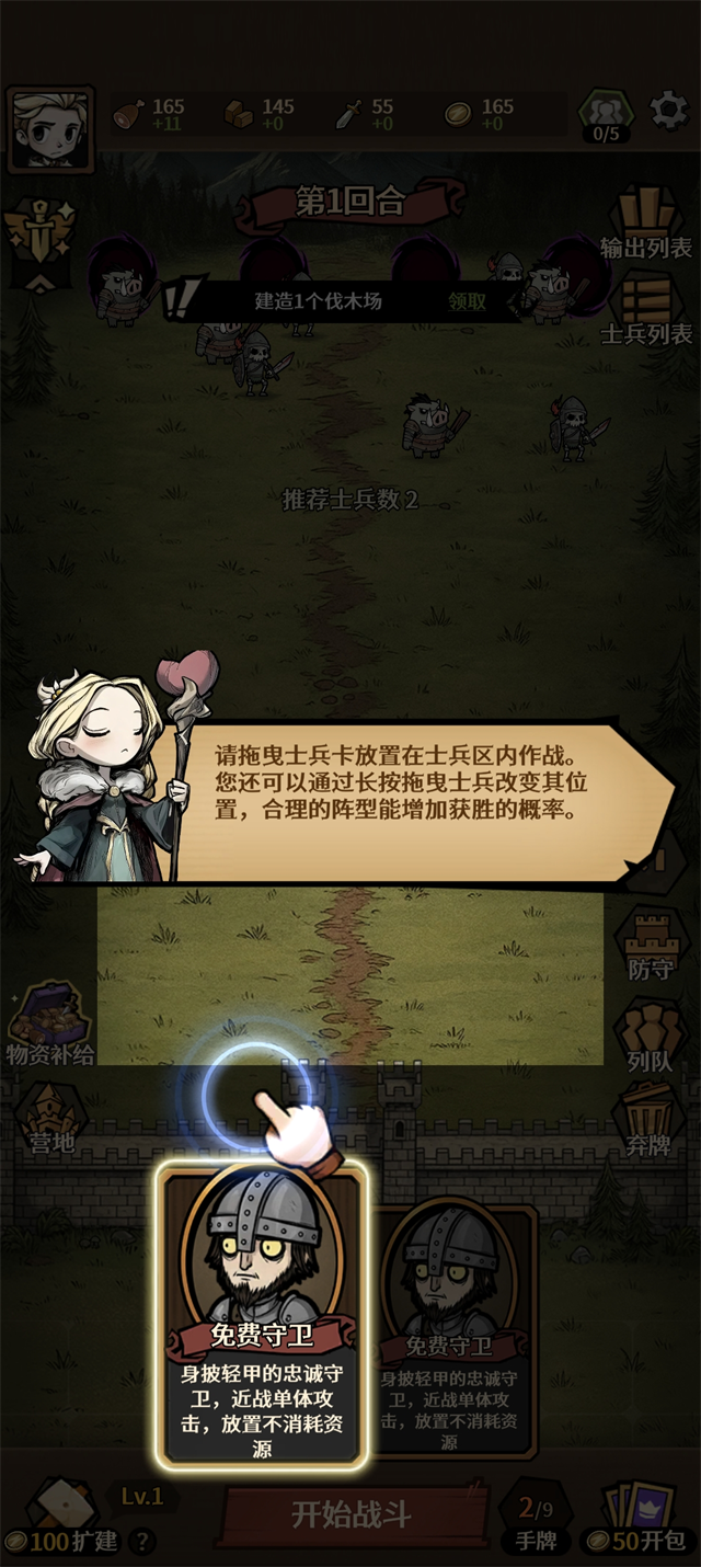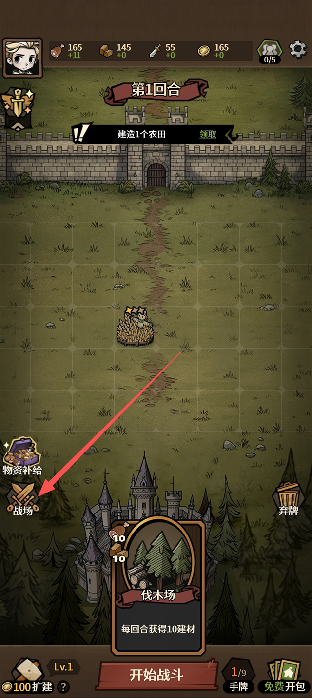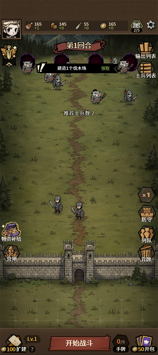 1-10回合:木材是优先级第一的,食物第二,武器无所谓,这个阶段基本不缺武器,随便上点基础建筑就好了(木材不够时可以看广告升级一次建筑,每回合都有一次机会,别忘了升级)。