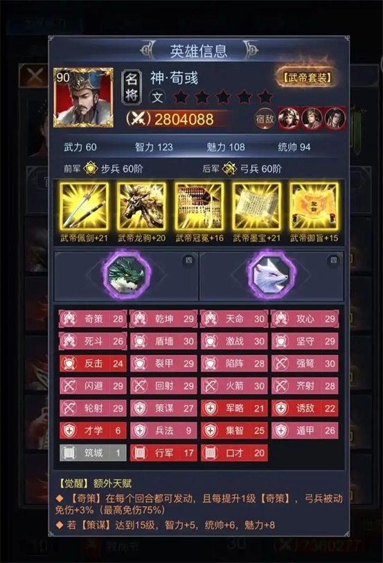 虽然荀彧有着这么高的免伤,但是他的伤害真的低,虽然没回合都可以释放奇策,但是那个伤害是真的不忍直视,所以其实我们在装备选择和技能选择就要在这方面下功夫了,这也就是为什么荀彧必须要学遁甲的原因了,好了了解完这两个方面我们接下来说说具体怎么培养吧。