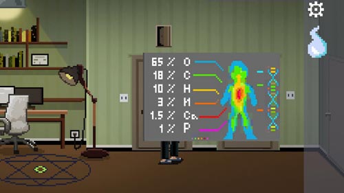 在合成药水之前,我们可以到书房墙壁上看到一幅画,这是人体元素构成图,其中O占据65%、C占18%、H占10%、N占3%、Ca占1.5%、P占1%。记住这些比例以及各元素所对应的颜色颜色。
