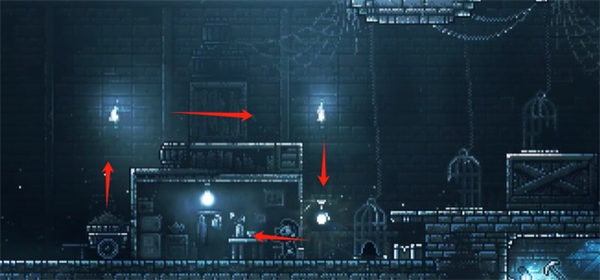 7、流浪者视角。按下黑色怪物左边的按钮,3个铁笼升上去,爬上铁笼往右走,然后爬最右边的梯子上去。