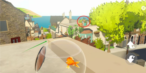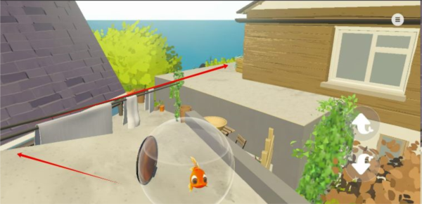 跟随红色箭头掉落到花丛上(否则鱼缸破碎死);然后那个缺口跳下去即可
