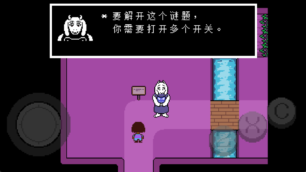 6、随后进入到东西向并且有两条小溪长廊上,Toriel需要你去拉下墙上有标记的杆子,一共需要拉下两个,那么东面的尖刺陷阱就会被移除。