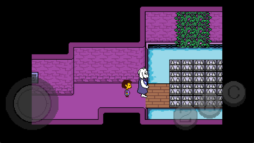 11、在右面的水池上有一个尖刺陷阱,Toriel会牵着你的手通过这个陷阱区域。