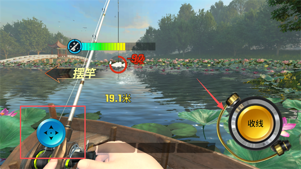 4、长按收线按钮,消耗鱼的体力,这家伙力道不小,当提示出现时,要像这样摆竿!