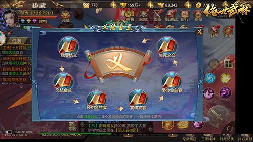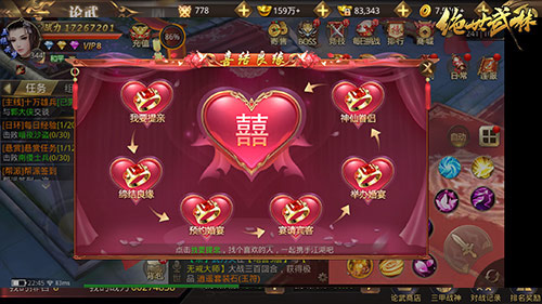 《绝世武林》的缘份系统分为两个玩法,一个是与异性结婚的执子之手,也就是结系统。一个是与同性结拜的胆肝相照,即结拜系统。