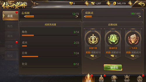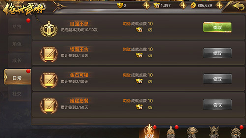 《绝世武林》的成就系统就在角色系统中,目前共有73个成就,大致分为角色、成长、日常、社交四大类。每当玩家达成任意一个成就后,都会获得数量不等的绑定元宝。但需要注意的是,这里的奖励需要玩家手动领取,而非系统自动发放。