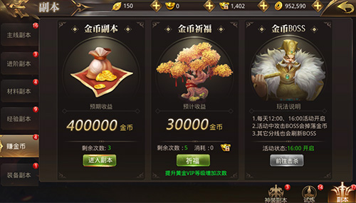 金币副本每天每位玩家可以免费挑战3次,每次挑战结束后,都会有五分钟的冷却时间。玩家可以趁这个时间去体验下其他赚钱玩法。