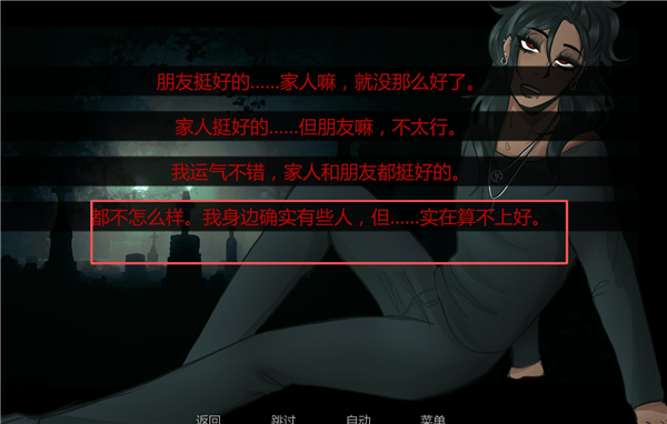 11、后面与结局一相同:【你想要变得正常吗】→【和我说说童年朋友吧】(4个都要选一次)→【你居然真的有朋友】→【你到底有什么毛病】→【我运气不错,家人朋友都好】→【你不赞成的皱起眉】(共3次)→【这算什么问题,你在搞什么鬼啊】