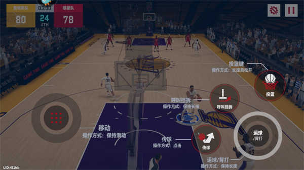 3、游戏操作相对来说较复杂,需要玩家多玩几局,熟练一下,游戏界面右侧为投篮、呼叫挡拆、传球、运球/背打。