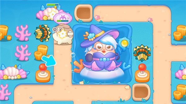 女巫抛洒紫色能量气泡包裹住炮塔,使炮塔暂时无法攻击。小伙伴们快帮忙戳破紫色气泡,与阿秋一起共抗深海女巫,化解这场危机!
