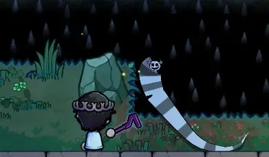 遇到这种蜈蚣时,注意用红框框柱的区域,打掉这些位置时,会发射四散弹幕。