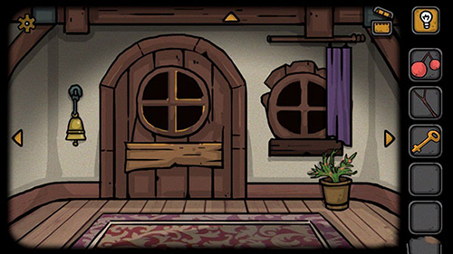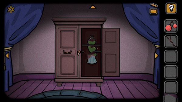 这个密码的意思就是左3右5左2,是不是很头大,这个密码是给那个铃铛用的,铃铛在大门上,我们需要一直向右换场景出莉莉房间,到房子的大门这里我们就能看到铃铛了,然后就是左摇3下,右摇5下,左摇2下,就会掉落一个钥匙给我们。这个钥匙就是我们衣柜的钥匙了,打开衣柜获得魔药和衣服。