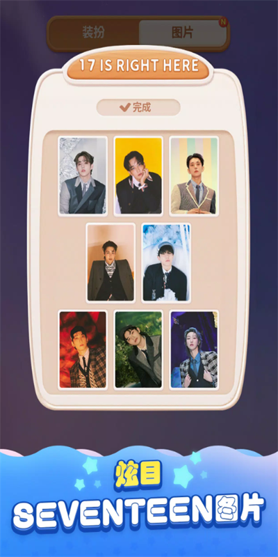 2、舞台造型时装:提供还原SEVENTEEN舞台造型的时装,让玩家可以为角色装扮。