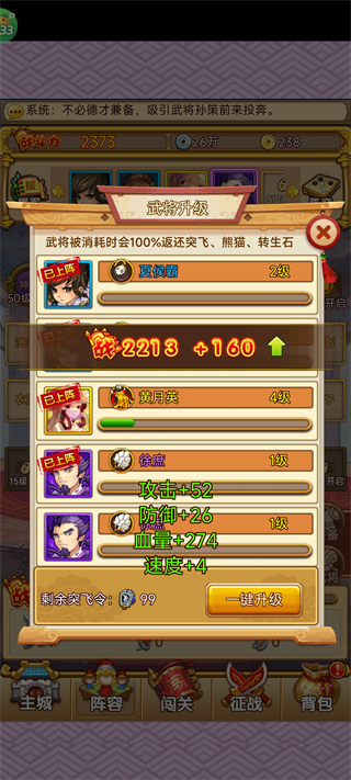 4、合理消耗突飞令快速提升武将等级,显著增强整体战力,从而应对更高难度的关卡挑战。