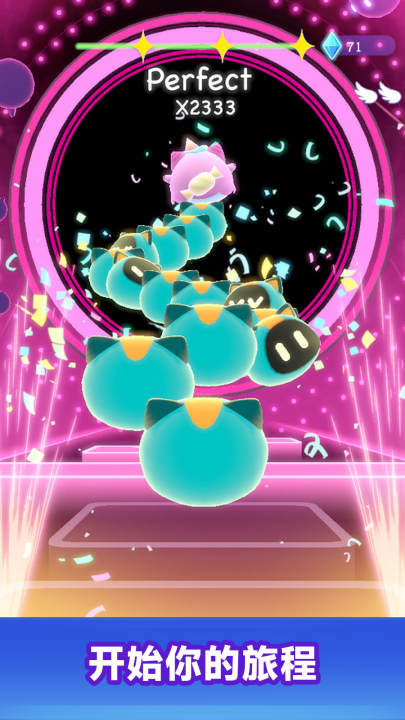 2、透过跳跃和躲避一系列障碍、随著音乐的节奏点击或滑动来引导你的小猫。
