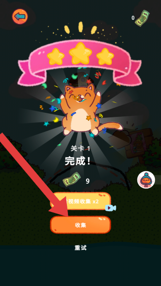 画面呈现出关卡1已顺利完成的状态,玩家获得了3颗星和9点金钱奖励,点击收集这些奖励后,系统会自动引导进入下一关的场景。
