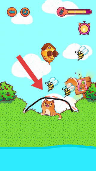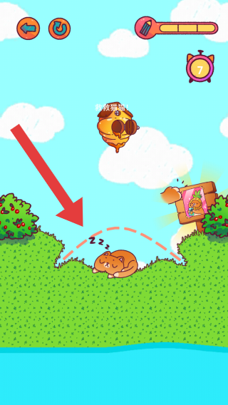 画面展示出一片草地的景象,正上方有蜜蜂即将发起攻击的画面,下方则有一只猫咪正在熟睡,需要按照任务提示来解救这只猫咪。