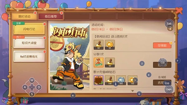 活动:除了一些特定的氪金活动之外,猫和老鼠的活动还是比较福利的。玩家根据活动的要求完成之后即可获得奖励。虽然说钻石的奖励数量不是很多,但是胜在每天都可以获得,坚持完成之后也是一笔不小的收入,建议大家关注游戏中的活动奖励。
