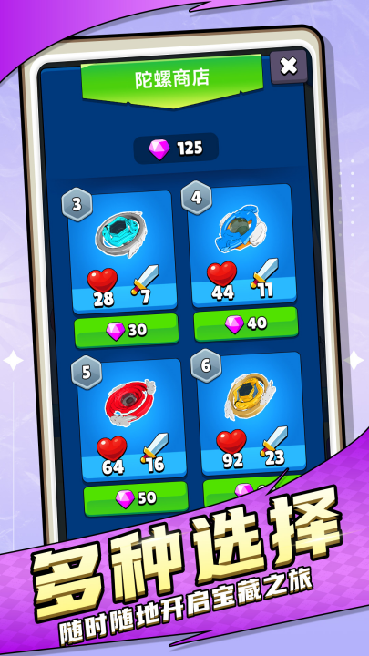 3、百变陀螺图鉴,收集50+独特设计的陀螺,从复古木纹到赛博朋克风格应有尽有。
