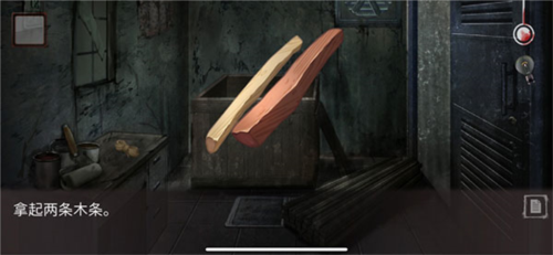 2、再去桌上看到绳子进行获取,点击【绳子】以及【两根木棍】就能合成一个道具,然后对着铁门使用。