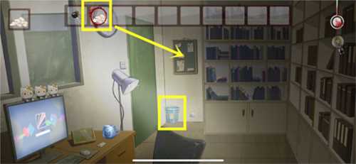 6、拿到灯泡之后需要回到丽芯办公室,点击更换【灯泡】,再次点击【垃圾桶】然后就能收集新的道具【撕碎的纸片】。再对着旁边的【布告栏】使用道具【撕碎的纸片】。