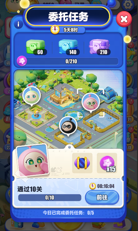 委托任务会在通关15关后自动开启,每日可完成的委托数量为5个。完成委托还能积累周活跃度,达到一定数值后就可以开启周活跃度宝箱,获得宝箱奖励~