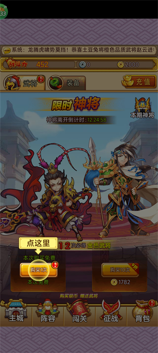 1、进入游戏后,优先参与「限时神将」活动,使用系统赠送的免费1次抽取,前期即可快速获得橙色或金色高品质武将,为阵容奠定良好基础。
