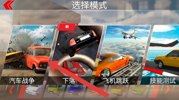 当前页面处于选择模式,包含汽车战争、下落、飞机跳跃等选项,你可以按照提示点击第一个选项进入场景开始游玩。