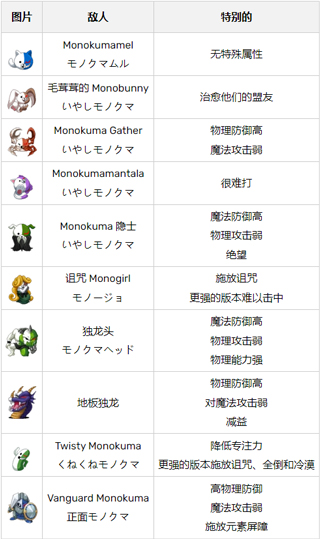 有 26 种主要敌人类型,每种类型都有许多不同颜色的交替形式,可以增加力量。其中一些变种有另一种眼睛颜色,这表明它们的元素弱点(例如,如果它们有黄色的眼睛,它们对闪电很弱)。并非所有敌人都有这个元素弱点,但它很有用。