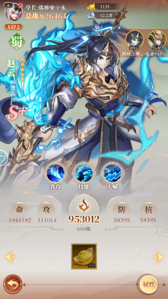 【神将1星天赋】:我方每次触发暴击后,帝尊关羽提高自身5%暴击和5%暴击伤害,持续3回合,可叠加