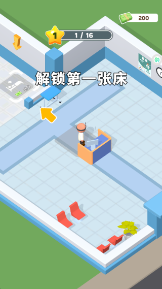 2、前往下一个房间解锁一张床,开始接收病人,解锁更多的床位,治疗病人。