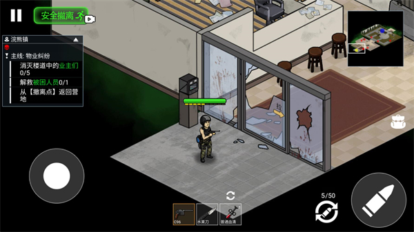 3、进入关卡后左边控制角色的移动,右边是换弹、射击和背包按钮,屏幕下方的是你的武器和治疗道具,右上角的是关卡地图,左上方的是你的任务。
