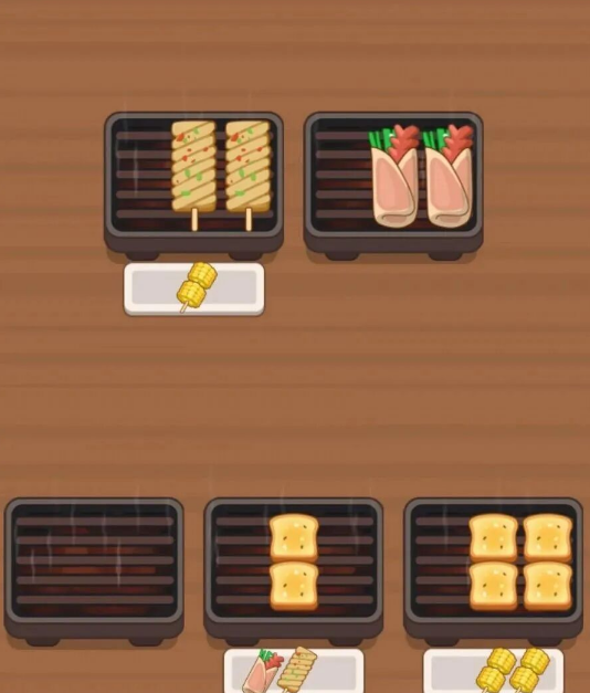 1、玩家第一次进游戏的时候,会有提示告诉你怎么玩。你只要把烤串拖到烤箱里,凑够三个一样的烤串,就能合成一个订单。