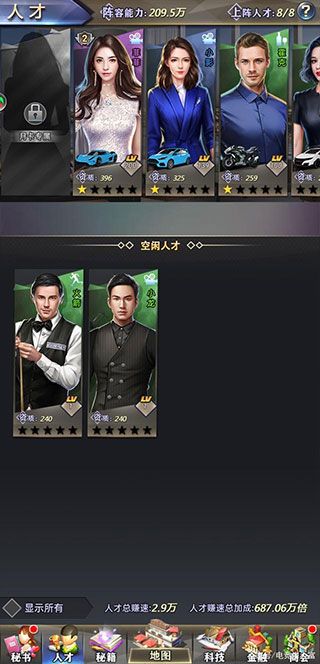 游戏设有影星、名人、歌手、运动员四大类人才,可通过招聘、活动等方式获取。人才的能力、资质与技能直接影响商战胜率与赚钱效率。配备专属座驾与秘书,可进一步提升其属性与收益加成。