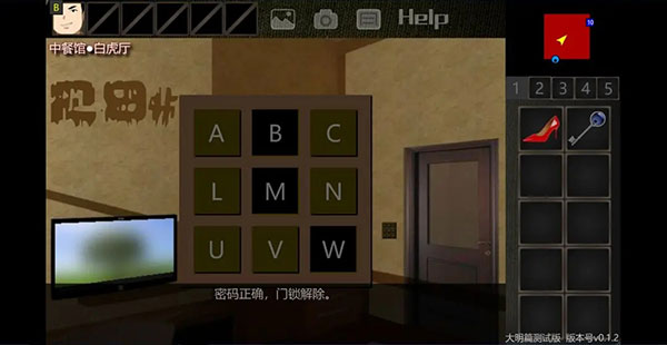 15、回到走廊,查看机关,根据线索“A=H T=I”的提示,我们可以得知,字母需要加工才可以得到答案,现在我们得到的字母线索只有“BMW”,而加工,即为去掉字母的上半部分,所以密码即为DIVIVV。