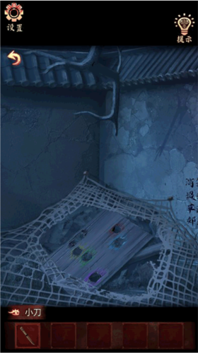 3、点击墙角的网,用【抽绳】抽落树上的【小刀】