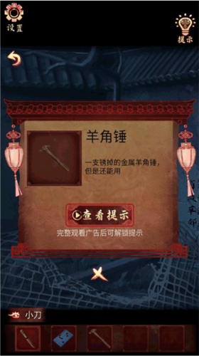 2、用【抽绳】取得墙角的小刀,用【小刀】划开网,取得【带孔木板】和【羊角锤】。